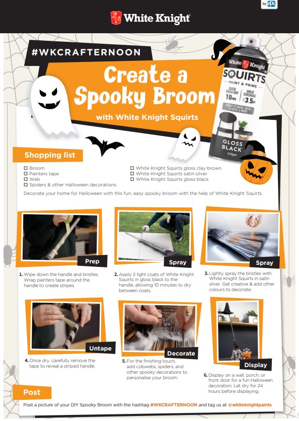 Decorate your home for Halloween with this fun, easy Spooky Broom — made using White Knight Squirts spray paint. Perfect for adding a little frightful flair to your front door, porch or hallway display.